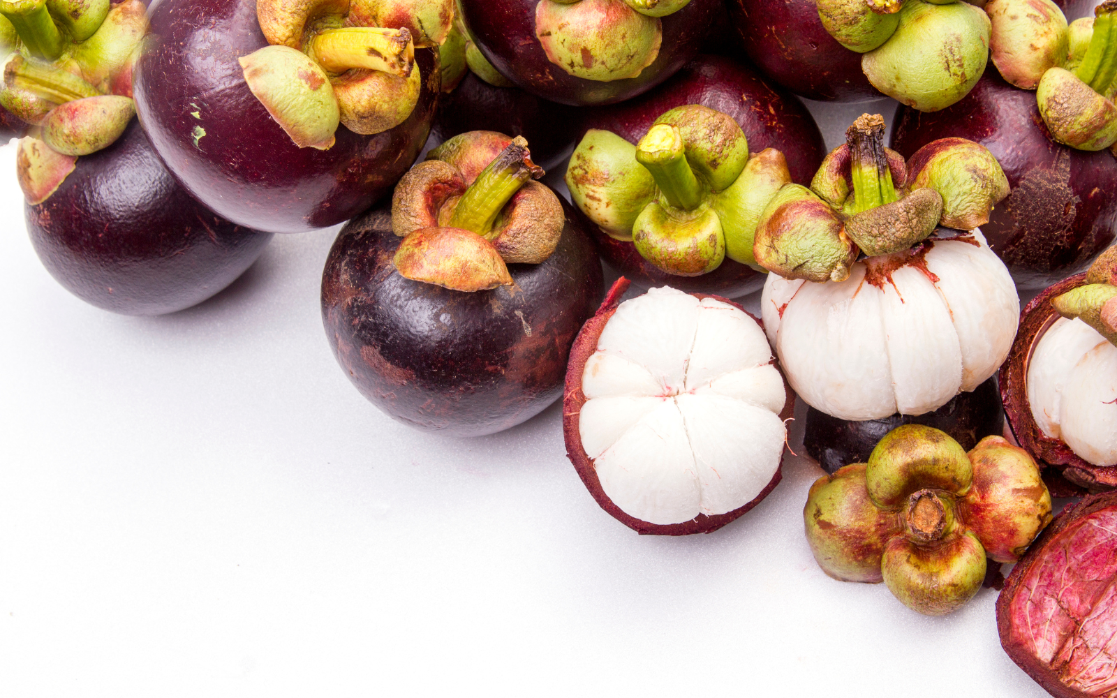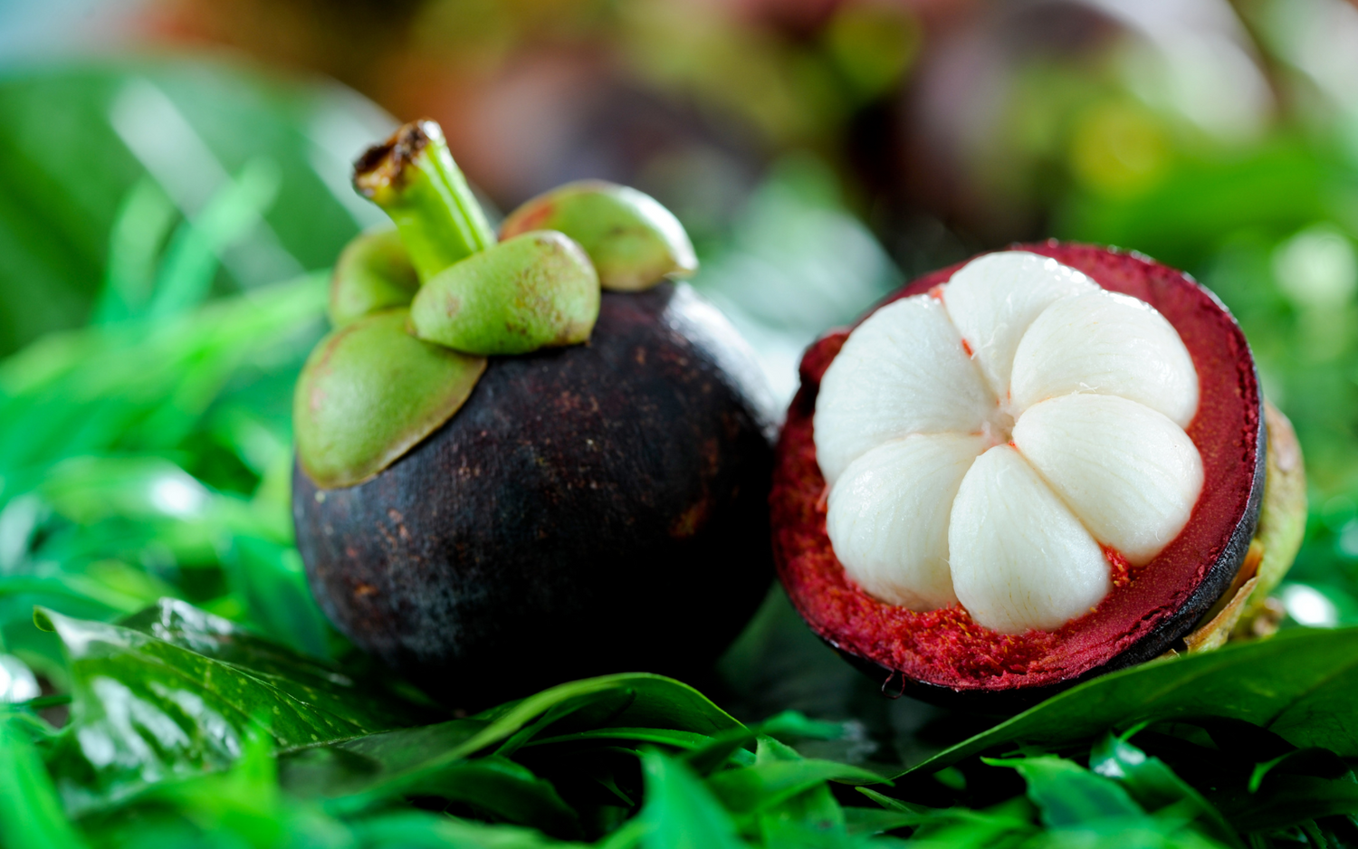 Mangosteen, a spherical fruit measuring 4-6 cm in diameter, showcases a purple shell characterized by its fibrous and firm nature. Within this outer layer lies a pristine white flesh, possessing a delicate texture and containing fluid-filled vesicles. The flavor profile of the fruit is a delightful combination of sweetness, tanginess, and juiciness.